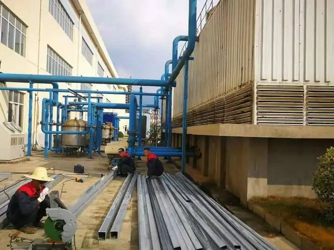 冷卻塔腳座與地面間安裝阻尼彈簧減振器,管路中安裝橡膠軟接頭,能有效地隔斷振動傳遞防止噪聲輻射。